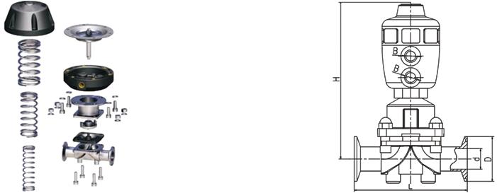 衛(wèi)生不銹鋼隔膜閥可安裝于任何位置,介質(zhì)流向?qū)﹂y門(mén)開(kāi)閉不影響結(jié)構(gòu)緊湊,氣動(dòng)隔膜閥適用