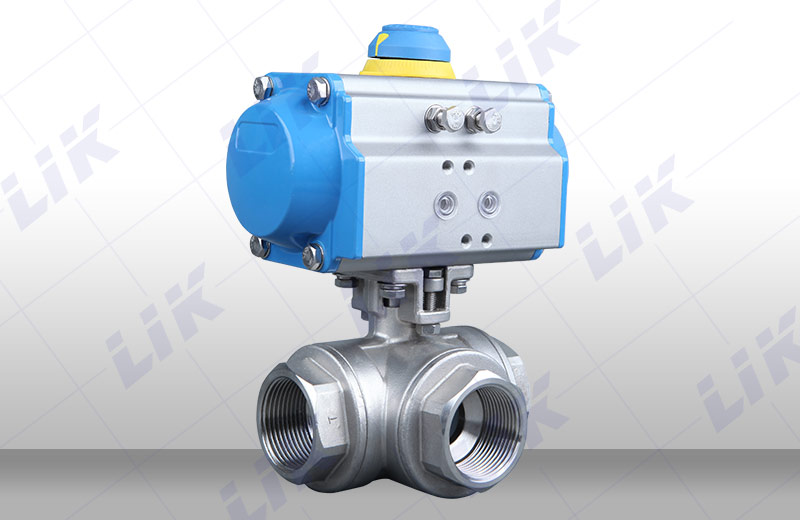 (1)氣動三通內螺紋球閥有兩座和四座密封結構,閥芯孔道有L型和T型兩種結構形式,采用控制閥芯旋轉角度,改變閥芯孔道與管道口的連接狀態,可實現對三條支管不同的組合控制。氣動三通內螺紋球閥流通能力大,可控制氣體、液體、蒸汽,更適用于控制高粘度,纖維顆粒狀的流體。也適用于密封要求較嚴格的場合。